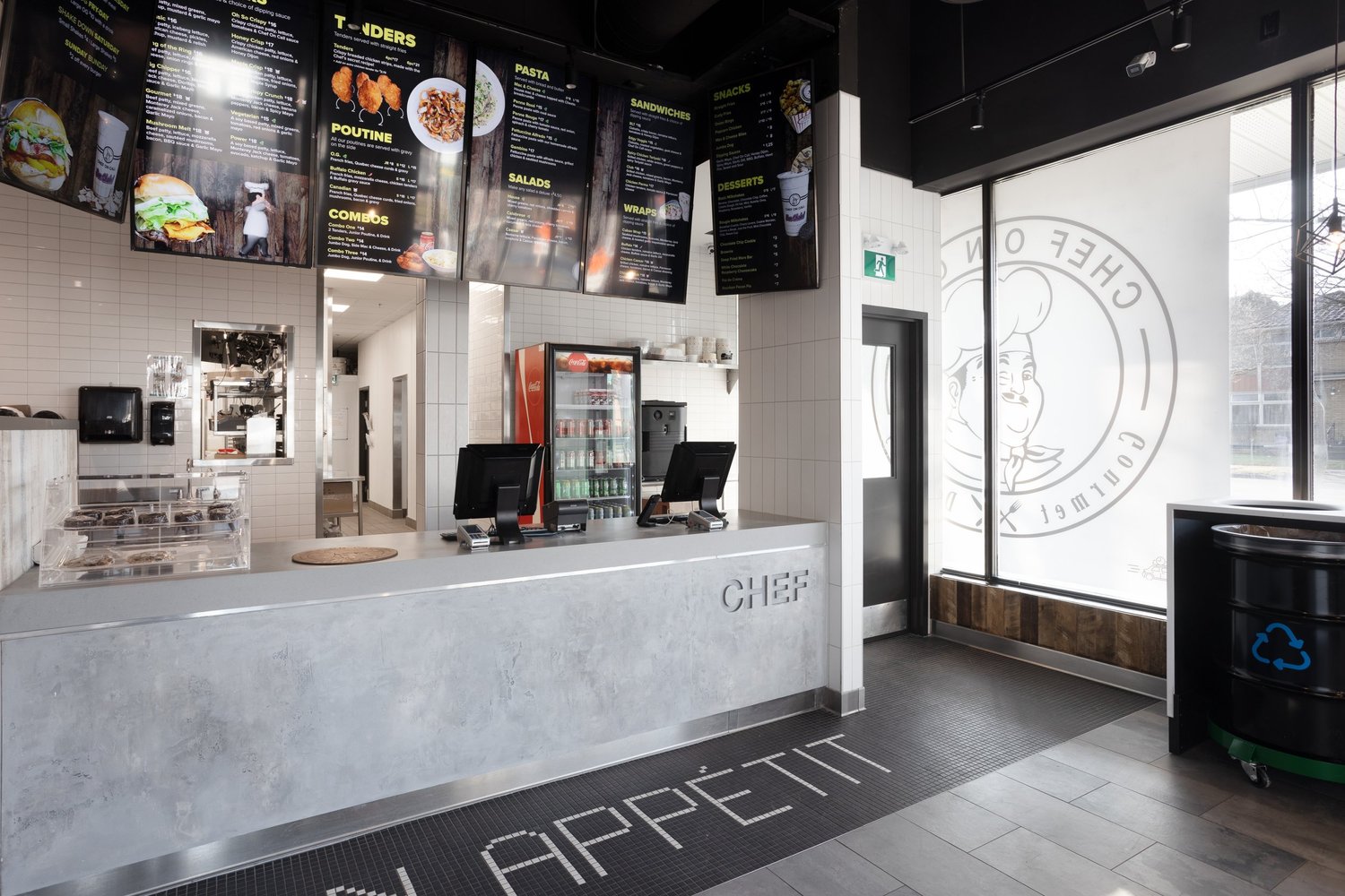 Chef On Call is a full service restaurant that started in Montreal and has expanded to London ON is tailored to serve exciting food and for late night snacks. The design utilizes reclaimed barn wood and concrete balanced with fun & colourful graphics.