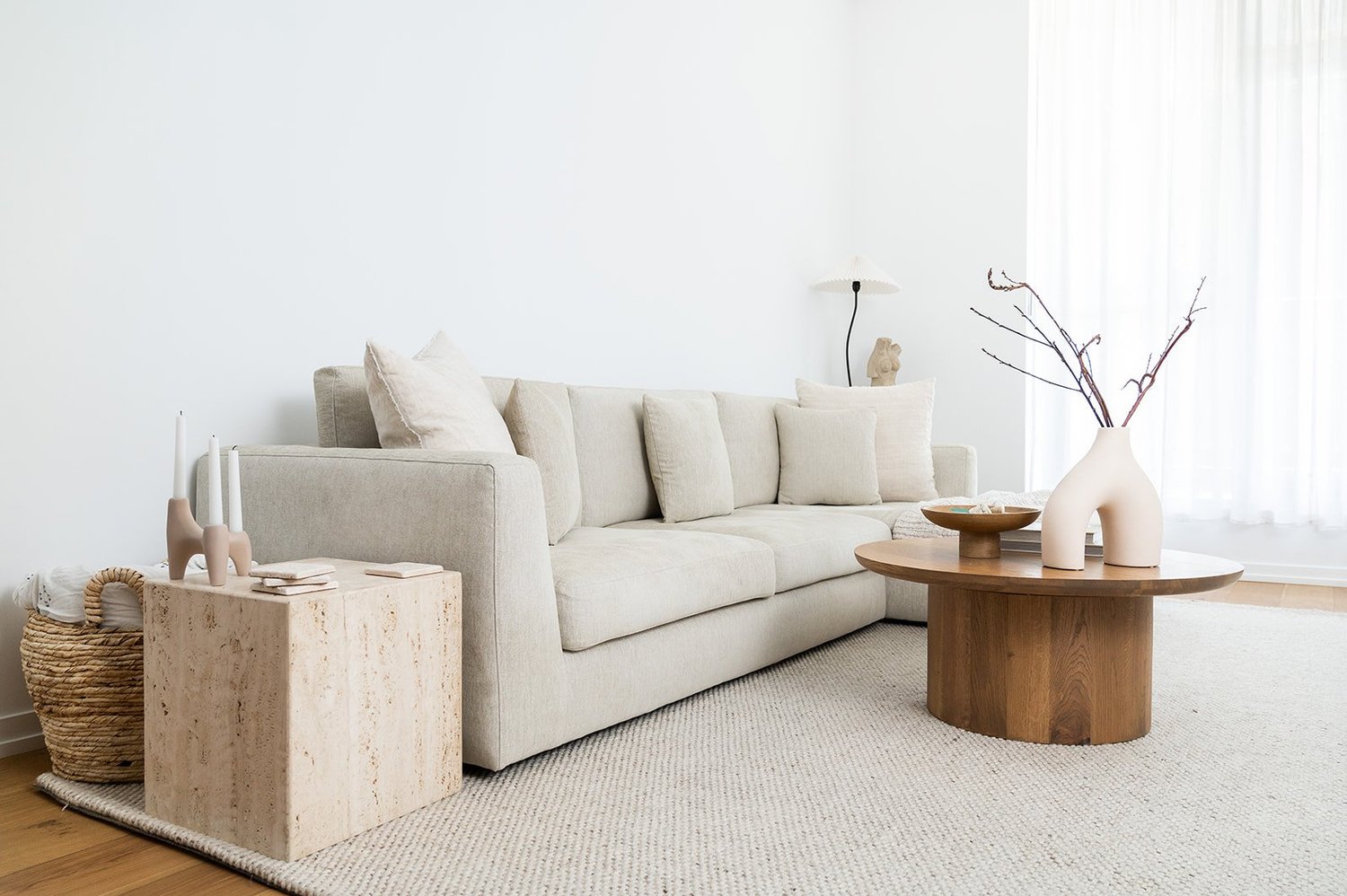 By minimizing clutter and unnecessary elements, the space is defined by the few essential pieces that make up the design like the living room furniture and tone on tone finishes. The goal is to create a peaceful and clutter-free living environment.