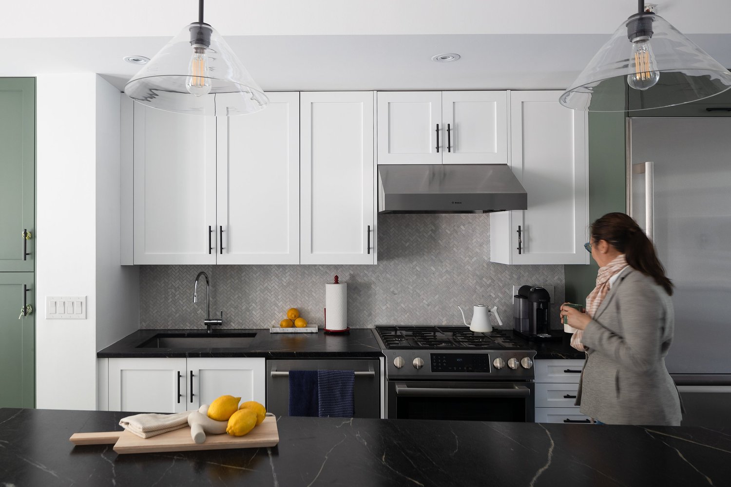 We reused some of the existing elements in the home like kitchen appliances, sink and faucet locations, and utilizing existing electrical connections to give them fresh new lighting fixtures.