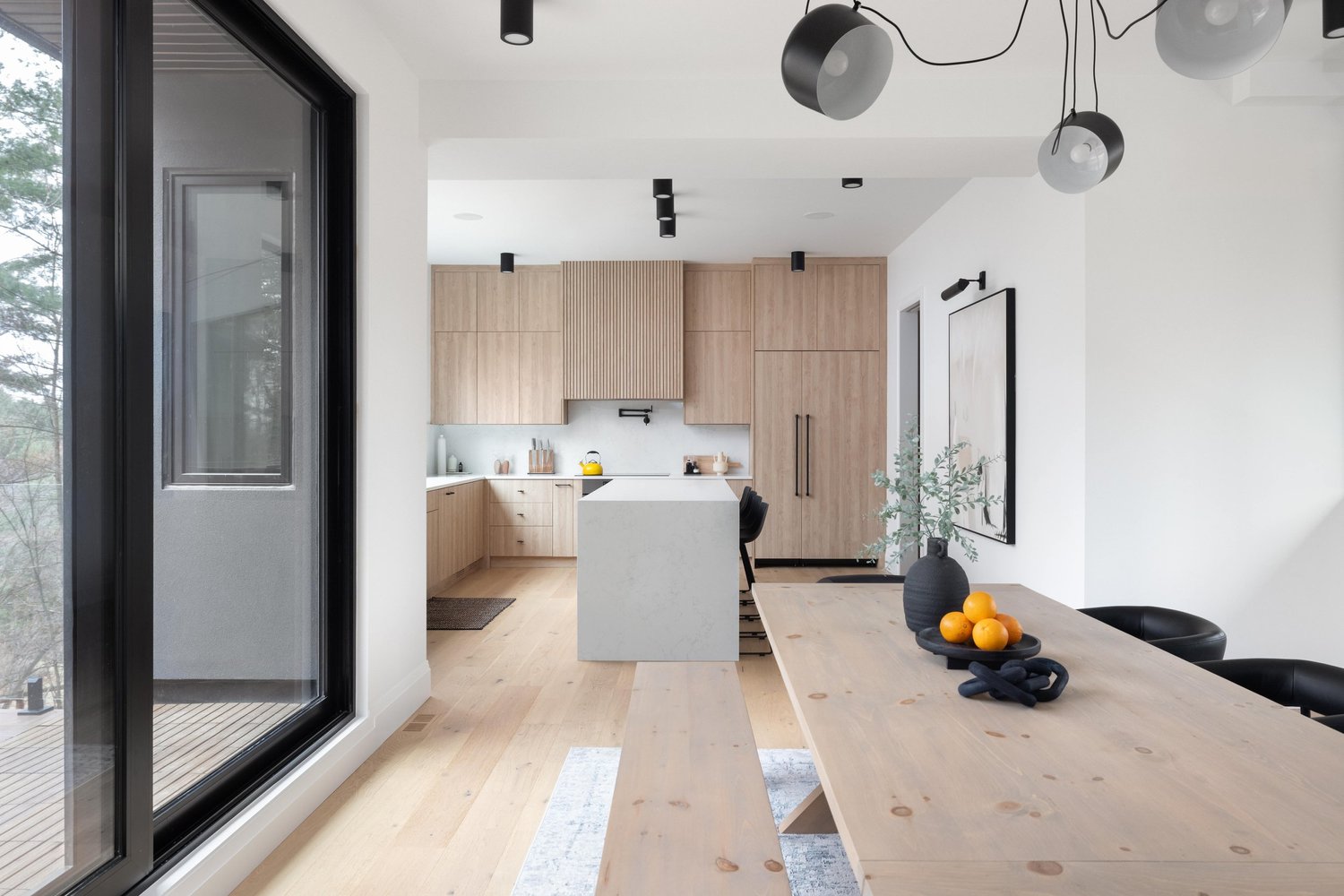 The single-tone light oak wood kitchen and pantry, seamlessly extending from cabinets to the slatted wood island hood, instills a sense of balance and visual harmony while also being easy on the eyes. Purposefully incorporating wood tones within the kitchen establishes both a material and visual connection to the breathtaking landscape beyond. A generously sized window, strategically centred above the sink, not only invites natural light but also fosters a seamless connection to the outdoors.