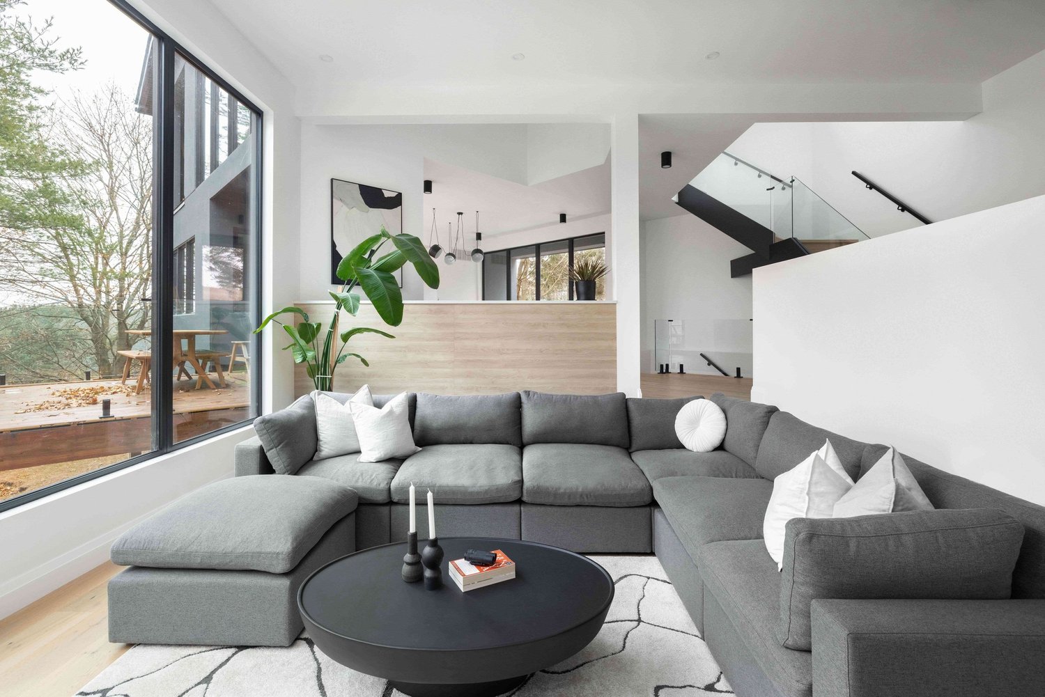 When placing rugs, make sure they’re big enough to fit under key furniture pieces like sofas and chairs to anchor the space.